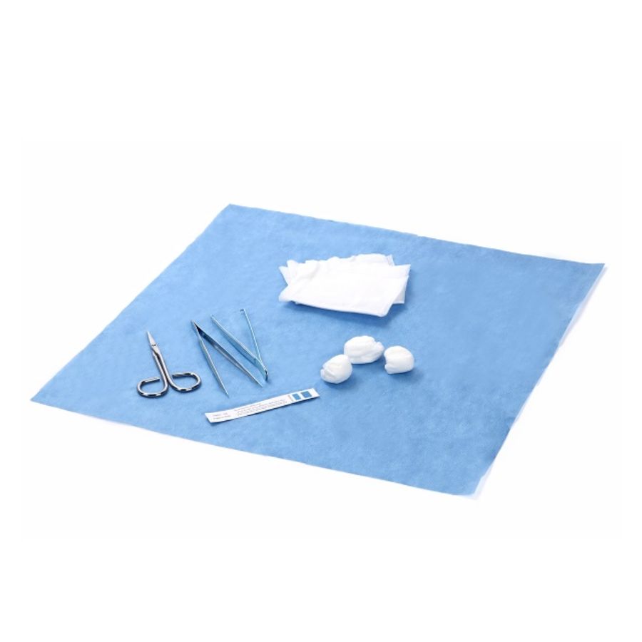 Kulki spunlace, spunlace 35g/m², 3 szt Jednorazowe pęsety opatrunkowe, metalowe, zaostrzone, 12cm, 1 szt Kleszcze do tkanek, metalowe, 12cm, 1 szt Podkładki spunlace, 14,5 x 19,35 cm, po złożeniu wymiary 7,25 x 9,75 cm, 4-warstwowe, 3 szt. Nożyczki do usuwania szwów, metalowe, 14cm, 1 szt Taca 17 x 11 cm, 1 szt Chusta 40 x 40cm, włóknina SMS 35g/m², 1 szt Karta wskaźnika sterylizacji, 1 szt |